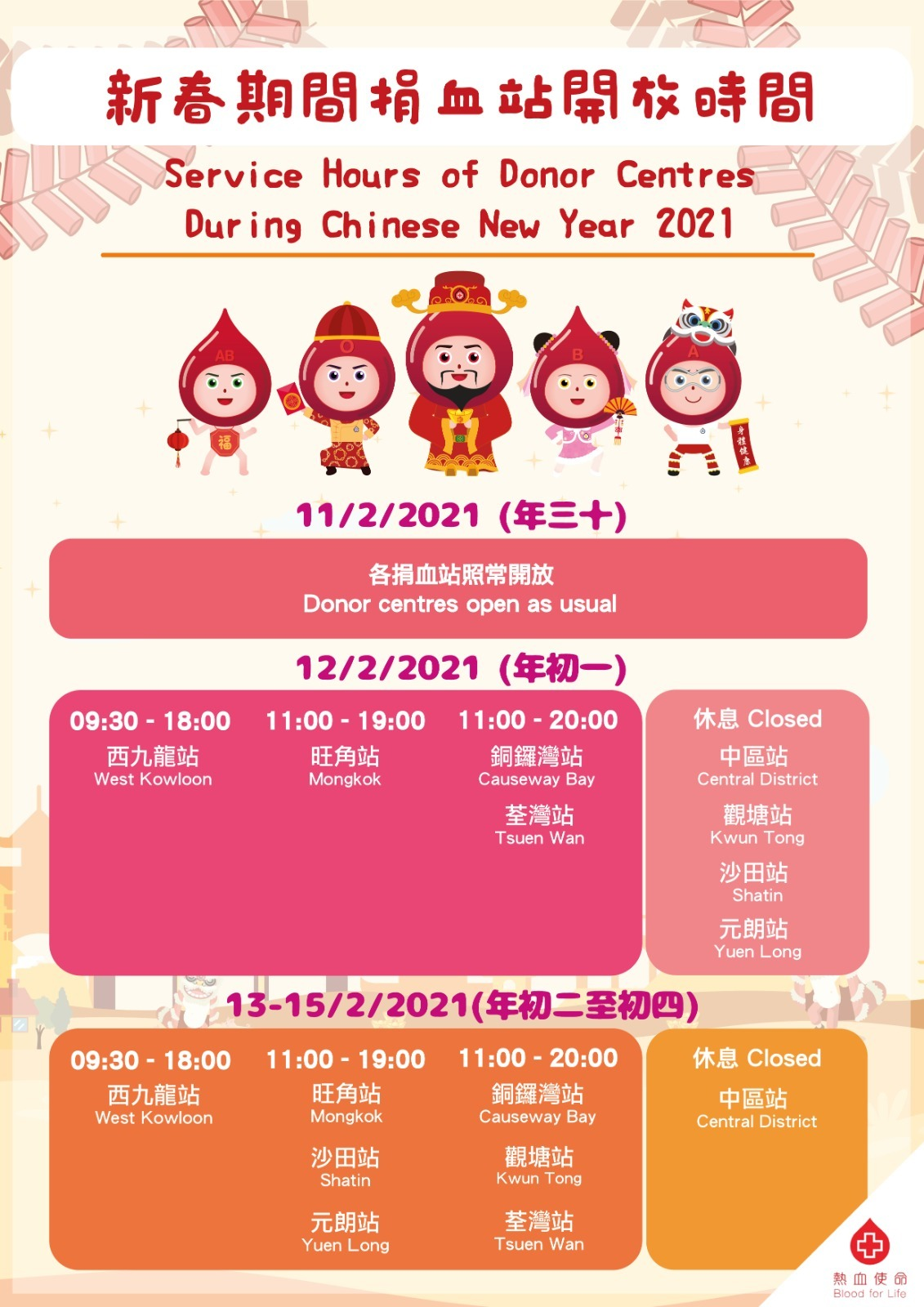香港紅十字會輸血服務中心今日(9日)宣布,農曆新年假期期間大部分捐血站均照常開放,方便市民前來捐血。中心同時呼籲市民在新春期間捐血,以增加血庫儲量,讓病友平安渡過「年關」。