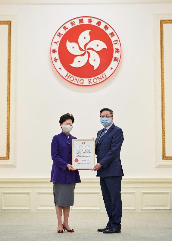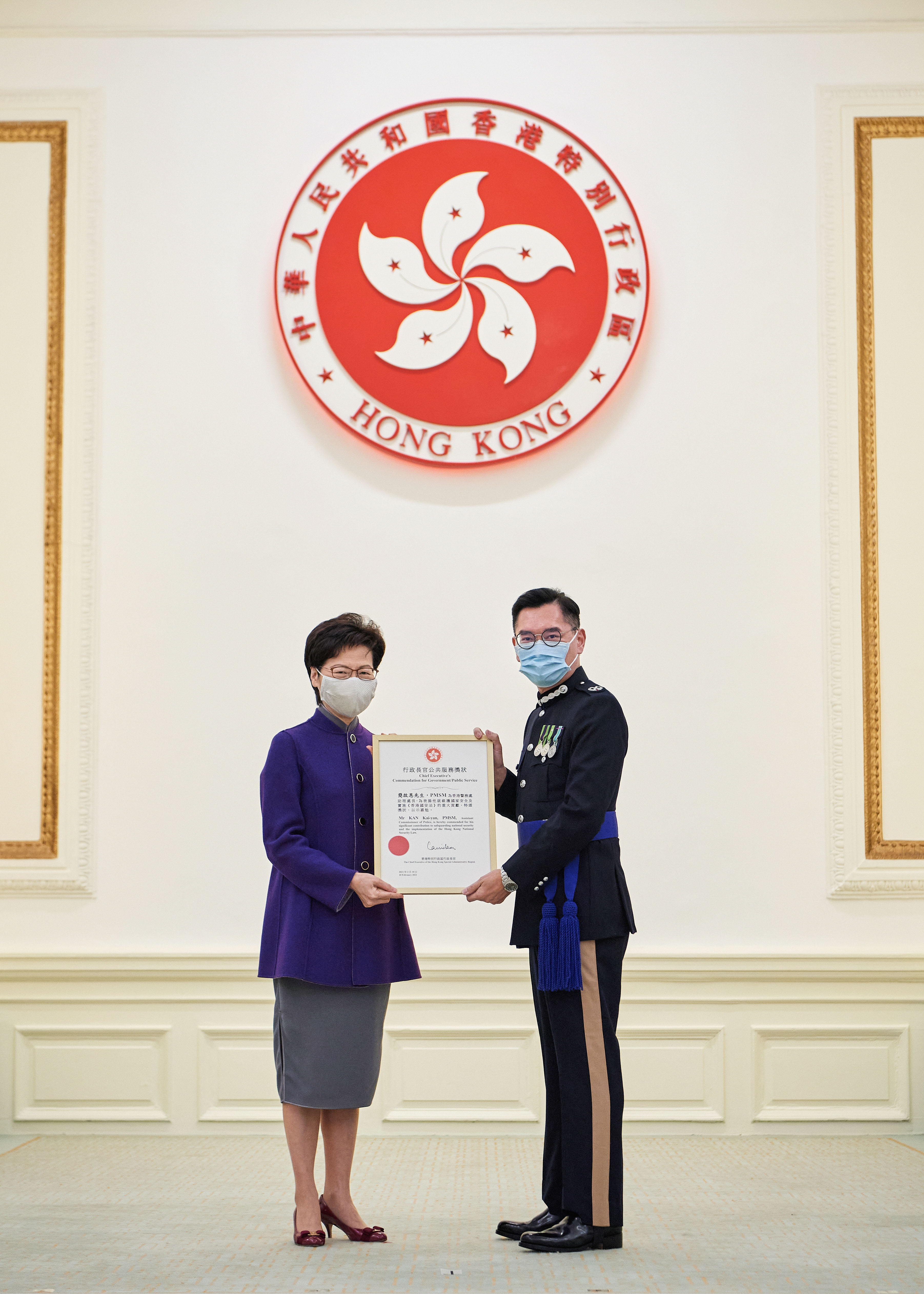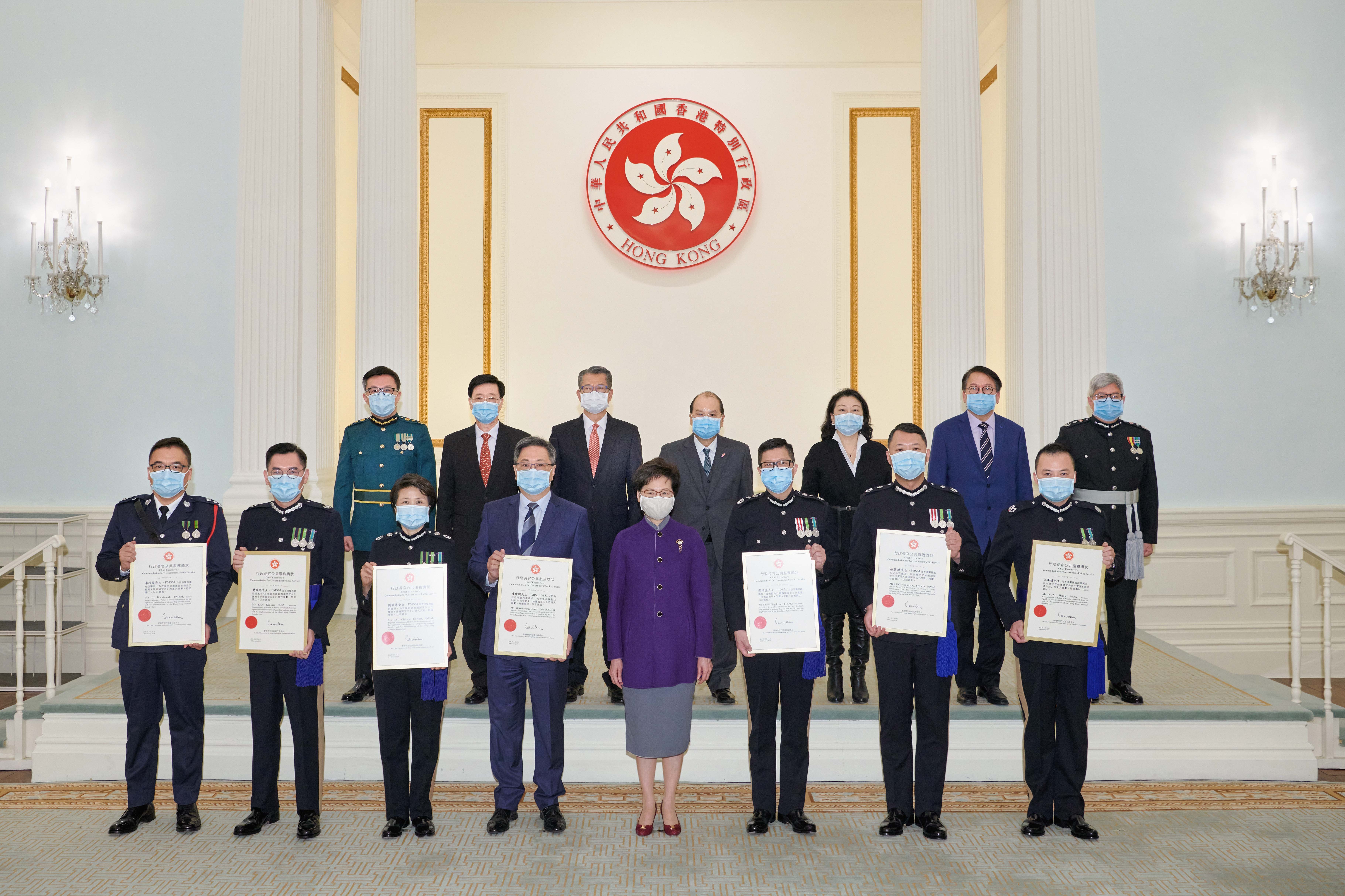 行政長官林鄭月娥今日(10日)向7名現任和前任高級警務人員頒發行政長官公共服務獎狀,以表揚他們就維護國家安全的重大貢獻,包括警務處前處長盧偉聰、現任處長鄧炳強、負責國家安全的副處長劉賜蕙、國家安全處處長蔡展鵬、兩名助理處長簡啟恩和江學禮,以及國安處高級警司李桂華。