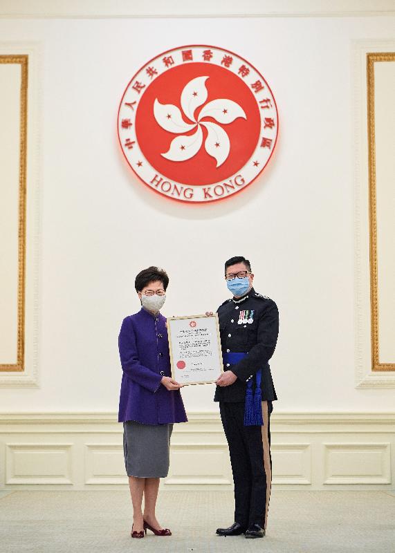 林鄭月娥(左)頒發獎狀予警務處高級助理處長蔡展鵬。