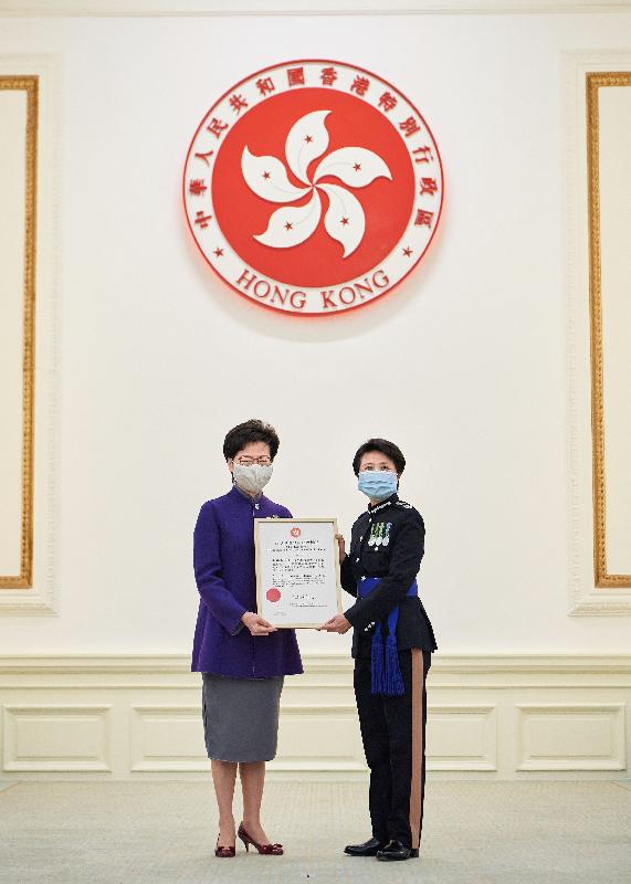 林鄭月娥(左)頒發獎狀予警務處副處長劉賜蕙。