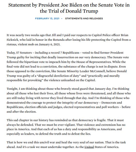 據美聯社周日報道,白宮在當地時間周六深夜發表美國總統拜登的聲明。在聲明中,拜登針對美國前總統特朗普在彈劾中未被定罪一事表示,所有美國人,尤其是領導人,都有義務和責任 「捍衛事實,打敗謊言」。