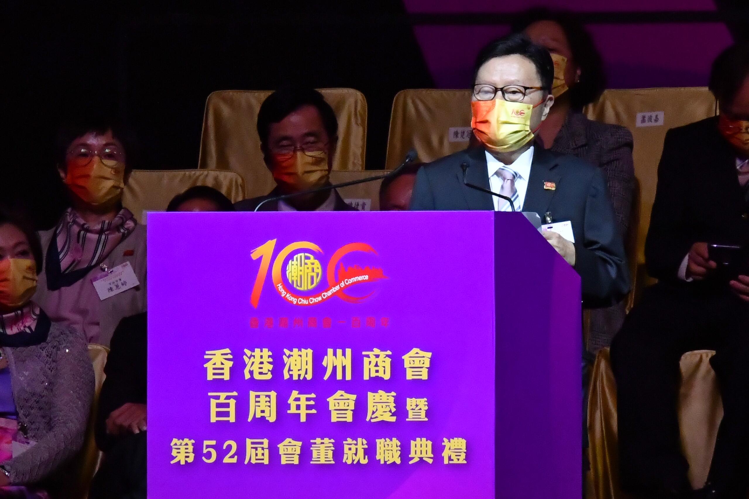 香港潮州商會日前假灣仔會展中心舉辦「香港潮州商會百周年會慶暨第52屆會董就職典禮」,黃書銳任新一屆會長。行政長官林鄭月娥、駐港國家安全公署署長鄭雁雄、中聯辦副主任何靖、外交部駐港特派員公署副特派員方建明、財政司司長陳茂波等應邀主禮。黃書銳指,新一屆董事會將繼續傳承薪火,再創輝煌。現場各界嘉賓友好與該會仝人聚首一堂,氣氛熱鬧。