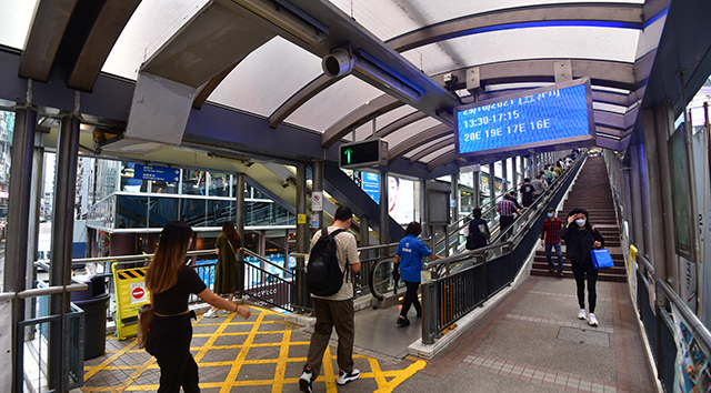 這天橋由廿條自動扶手電梯及至少三條自動行人道組成,上落方向也會因應上下班繁忙時間而不同,早上6時至10時扶手電梯往下走,之後便方向掉轉。這條電梯多年來都吸引不少在港遊客、外國人慕名而來,順勢乘搭到蘇豪區遊逛,亦成為不少經典電影、電視劇取景點,當中更有荷里活電影如《蝙蝠俠》系列也在此取景。(記者 崔俊良 攝)
