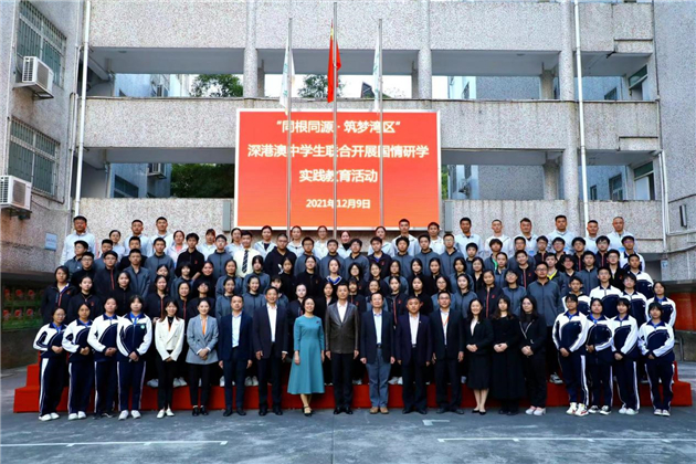 2021年12月9日下午,「同根同源·築夢灣區」——深港澳中學生聯合開展國情研學實踐教育活動啟動儀式在深圳市育新學校軍訓大棚舉行。該活動旨在貫徹落實中共中央、國務院印發的《粵港澳大灣區發展規劃綱要》的相關要求,強化內地和港澳青少年的愛國主義教育,加強憲法和基本法、國家歷史、民族文化教育,增加民族自豪感和認同感。