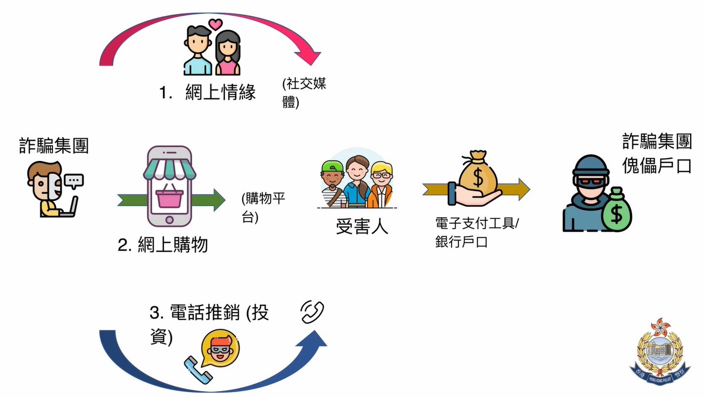 連健德指出,綜合多宗騙案得悉,約大多數的案件分別是購物、網上情緣和投資騙案。騙徒會在網上專頁以低於市價作招徠,出售口罩、美容產品、日本動漫人偶和貴價食材如和牛、藥材,騙取市民入數後失去聯絡,另外網上情緣騙案手法與過去雷同,但近日發現騙徒向受害人推介投資活動有上升趨勢。