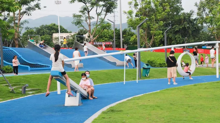 沿河而建的葵涌生態公園,不僅風光逶迤,內部還打造了一個沉浸式體驗全齡段參與、寓教於樂的兒童樂園巨型彈床、攀爬王、地形遊戲探索區等,是兒童節親子打卡的絕佳場所。
