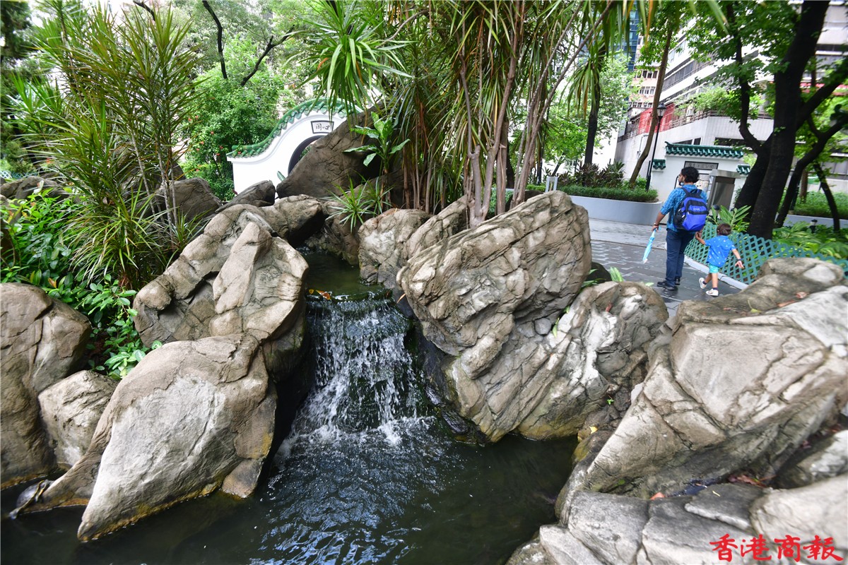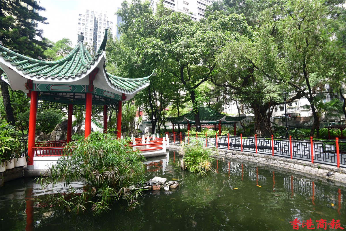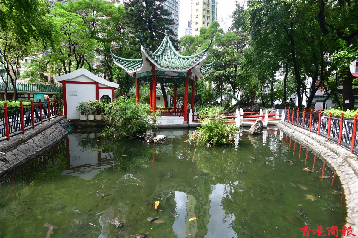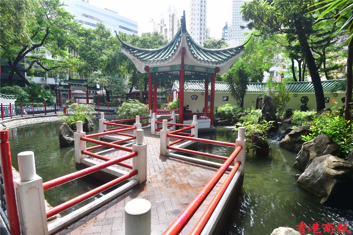 在公園中心的涼亭被中央水池包着,更有一條中式橋,邊散步邊欣賞池中魚,荷里活道公園可算是一個都市中的休閑加油站。(記者 崔俊良/攝)
