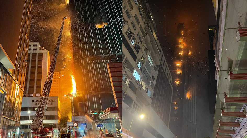 現場消息指,起火大廈有多個樓層起火,並有大量火屑飛落街上,剛巧有兩名市民閃避不及受傷,送往伊利沙伯醫院治理。由於火屑隨風四散,波及鄰近喜來登酒店、以及附近的國際電信大廈、遠東大廈及重慶大廈,逾百名市民在附近圍觀。受事件影響,現場一帶交通受阻。