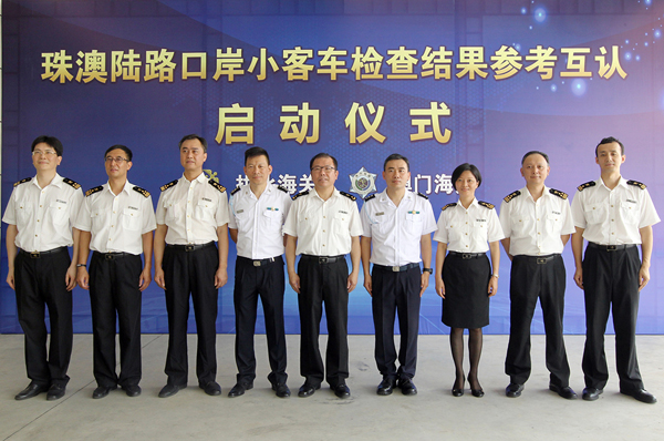 珠澳海关关员在陆路口岸小客车检查结果参考互认启动仪式上合影