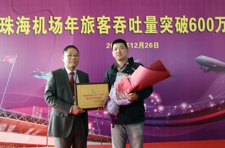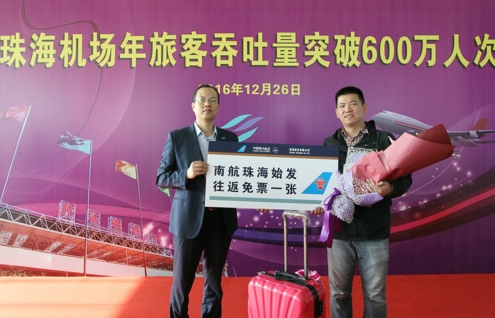 【香港商報網訊】記者陸紹龍報道:12月26日,對於珠海機場來說是一個值得銘記的日子。下午15:05,南航CZ3752上海至珠海航班緩緩降落珠海機場,剛走出飛機艙門的上海籍旅客譚曉棟便被獻花和閃光燈包圍,幸運地成為2016年珠海的第600萬名旅客。