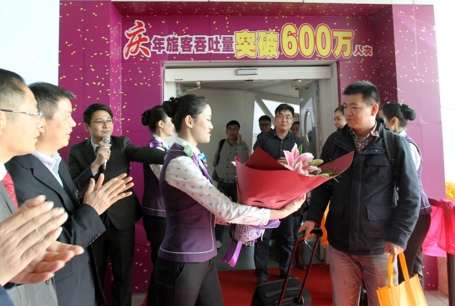 上海乘客譚曉棟成為珠海機場第600萬名旅客,接受到機場乘務員獻花