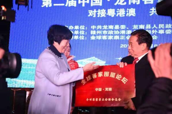 會上進行了“全球客家圍屋論壇”授牌儀式,全球客家崇正會聯合總會授予龍南縣“全球客家圍屋論壇” 牌匾。