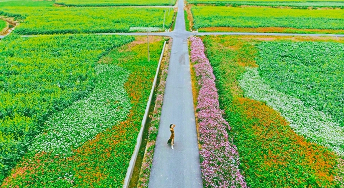 数千亩油菜花、波斯菊、硫华菊、百日草盛放