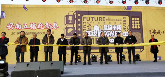 南昌市旅遊發展委員會主任兼書記陳清華、江西省非遺保護中心副主任殷建、安義縣文化廣電旅遊新聞出版局局長劉楓、綠地控股集團江西房地產事業部營銷管理中心安義區域總監塗文英等嘉賓出席此次市集開集儀式助力2019綠地安南小鎮新春文化旅遊季。