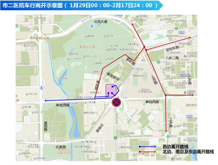 深圳市二医院车行离开示意图——蓝色线条为西边离开路线,红色线条为北边、南边及东边离开路线。