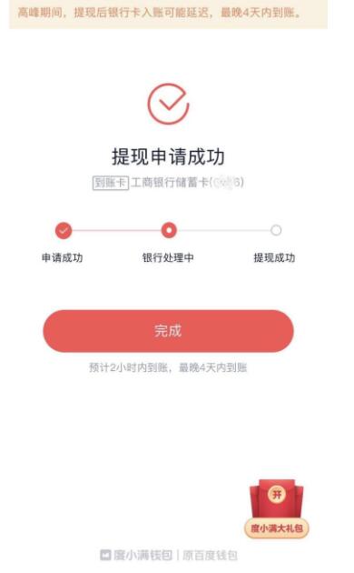 提现有两步:第一步,先从不同活动页面找到金额,点击金额或后面的“去提现”/“领钱”,即可提现到“度小满钱包”;第二步,从度小满钱包申请提现到银行卡;所有春节活动的现金红包提现到度小满钱包账户时,一般不超过24小时,审核通过后即可提现至银行卡,春节期间根据不同银行的情况通常1-4天到账。