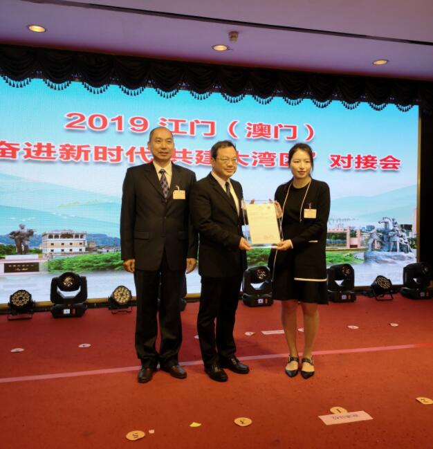 澳門市民高潔霞從江門市長劉毅手中接過粵港澳大灣區稅務智能櫃檯開出的首張完稅證明
