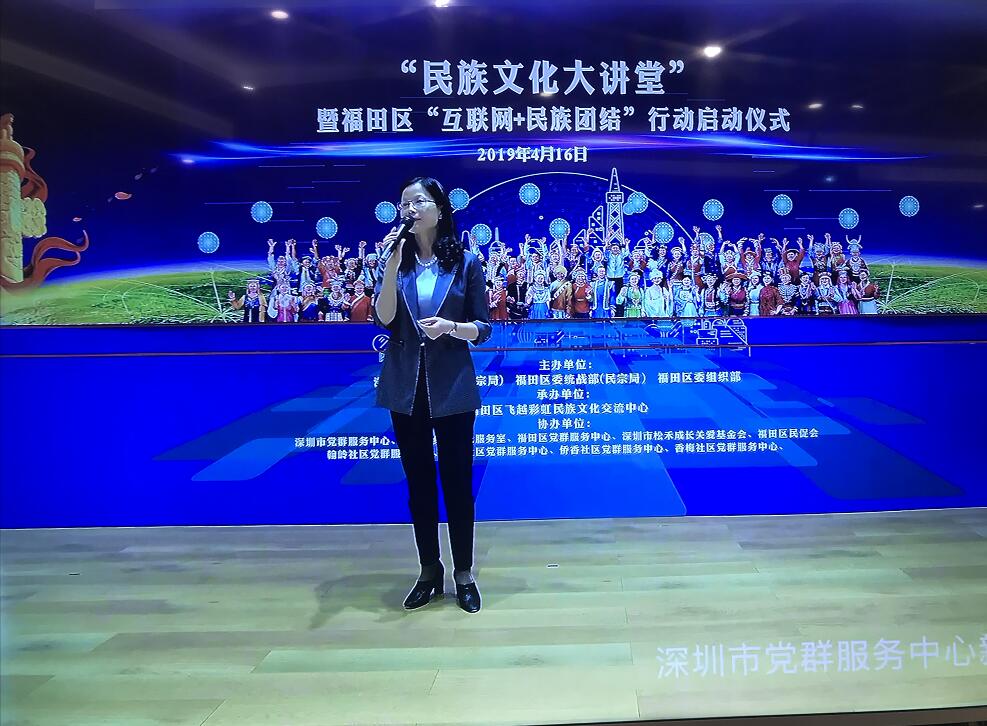 【香港商報網訊】記者 蘇偉 報導:4月16日下午,“民族文化大講堂”暨福田區“互聯網+民族團結”行動在深圳市黨群服務中心正式啟動。深圳市委統戰部副部長、民宗局副局長曾無非,福田區委常委、統戰部部長劉俊琳等領導和福田區各相關部門及各街道辦領導,以及文化界、教育界、各民族代表人士、媒體嘉賓以及社區居民共300多人參加了本次活動。