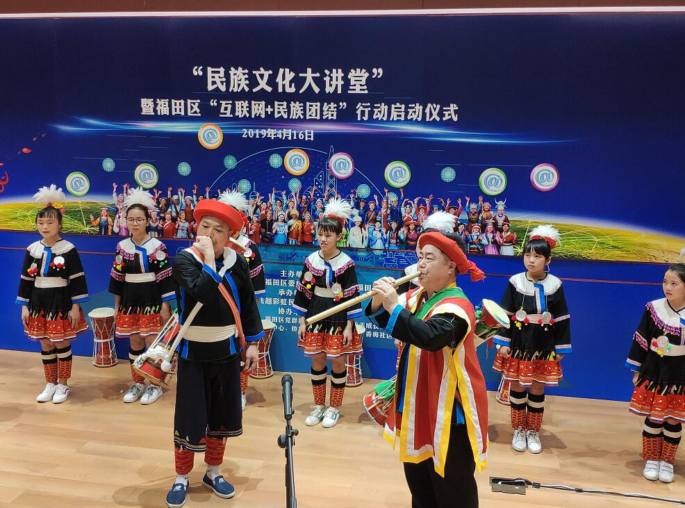 此次活動由深圳市委統戰部(民宗局)、福田區委統戰部(民宗局)、福田區委組織部聯合主辦,福田區飛越彩虹民族文化交流中心承辦。依託市、區、社區三級黨群服務中心先進的網路資源,實現與福田區黨群服務中心以及濱江、香梅、僑香、翰嶺四個黨群服務中心的現場連線。福田區飛越彩虹民族文化交流中心理事長王芳以“共用、共融、共存——廣東少數民族巡覽”為主題,講授“民族文化大講堂”第一課,通過精彩的圖文、生動的講述,全面系統展現了廣東各民族的多彩文化。現場和觀看網路直播的觀眾紛紛表示通過此次講座,深刻感受到廣東本土文化的魅力,進一步增強了民族文化自信。啟動儀式邀請飛越彩虹連南瑤族童聲合唱團來到現場,表演廣東連南瑤族地道的瑤歌和長腳鼓舞。孩子們純淨的音色,配合極具民族特色的表演,讓全場掌聲雷動。