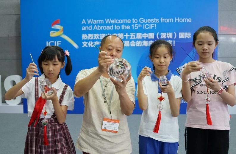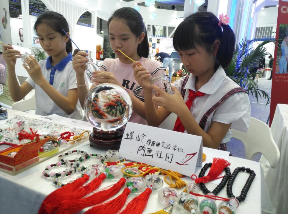 【香港商報網訊】記者 蘇偉 報導:在深圳「文博會」上,記者與老朋友深圳著名內畫大師非遺繼承人王一帆老師不期而遇,他說,這次參展代表深圳市羅湖區及文化館非遺保護中心參加的,他還把非遺進校園他教的學生深圳市羅湖區螺嶺外國語實驗學校的「內畫社團」的孩子們也帶到了文博會現場,目的是讓更多的小朋友們親身感受到內畫之美和讓非遺產品「活化」起來。讓非遺從生活開始從每個人認識瞭解開始從而得到傳承,記者在現場看到,每天他們的展位前都是人山人海,有家長帶孩子來的,也有學校組織同學們來參觀學習的,更有一些外國友人對內畫的神奇,驚歎不已,紛紛拿出手機拍照並購買。