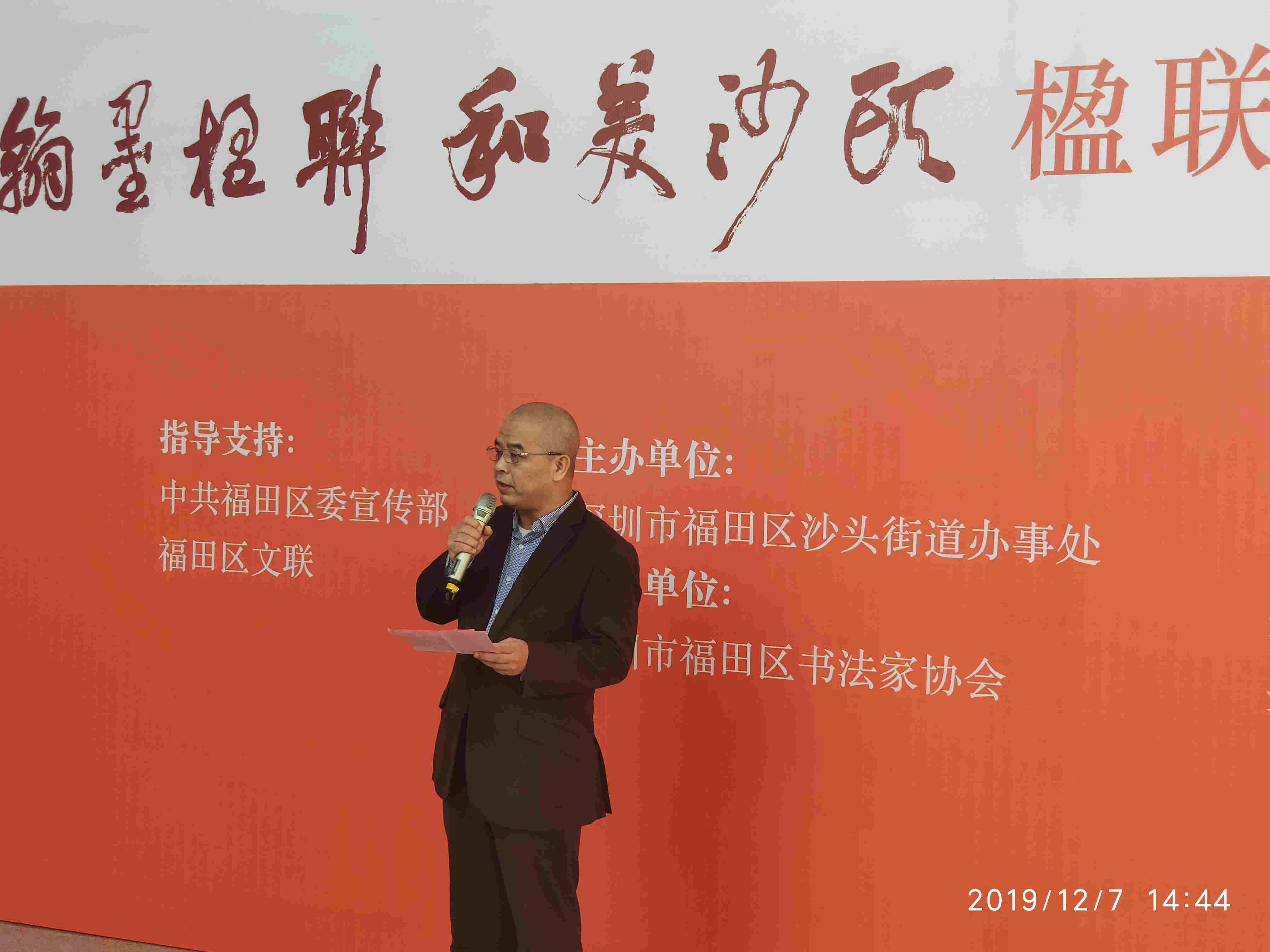 【香港商報網訊】記者 蘇偉 報導:由福田區委宣傳部、福田區文聯指導支持,深圳市福田區沙頭街道辦事處主辦,深圳市福田區書法家協會承辦,深圳市書法院、深圳市楹聯學會、深圳市青年書法家協會協辦的“翰墨楹聯 · 和美沙頭—楹聯書法展”於2019年12月7日下午在深圳市民中心圓滿舉行。此次展覽由趙永金擔任策展人,開幕儀式由福田書法家協會副主席、深圳技術大學書法藝術研究所所長徐磊副教授主持。
