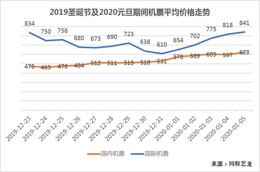 《報告》中來自同程藝龍的“雙旦”機票預訂大資料顯示,國內機票在2019年耶誕節和2020年元旦期間基本沒有出現明顯的價格波動,但整體呈現緩慢上漲的趨勢。具體來看,國內機票在2019年耶誕節前後處於相對低位,沒有出現明顯的價格波峰,而國際機票卻在平安夜前一天出現了834元的次高價(不含稅費)。國內機票在元旦當天的平均價格為578元(不含稅費),較平日略有上漲。《報告》分析認為,國內機票“雙旦”期間的價格曲線較往年相對平緩,主要原因在於2020元旦只有一天假期,並且距離春節黃金周僅有不到一個月的時間,大量的出行需求延後到了春節黃金周前後,2020年的春節黃金周出行需求因此也將比往年更為集中。