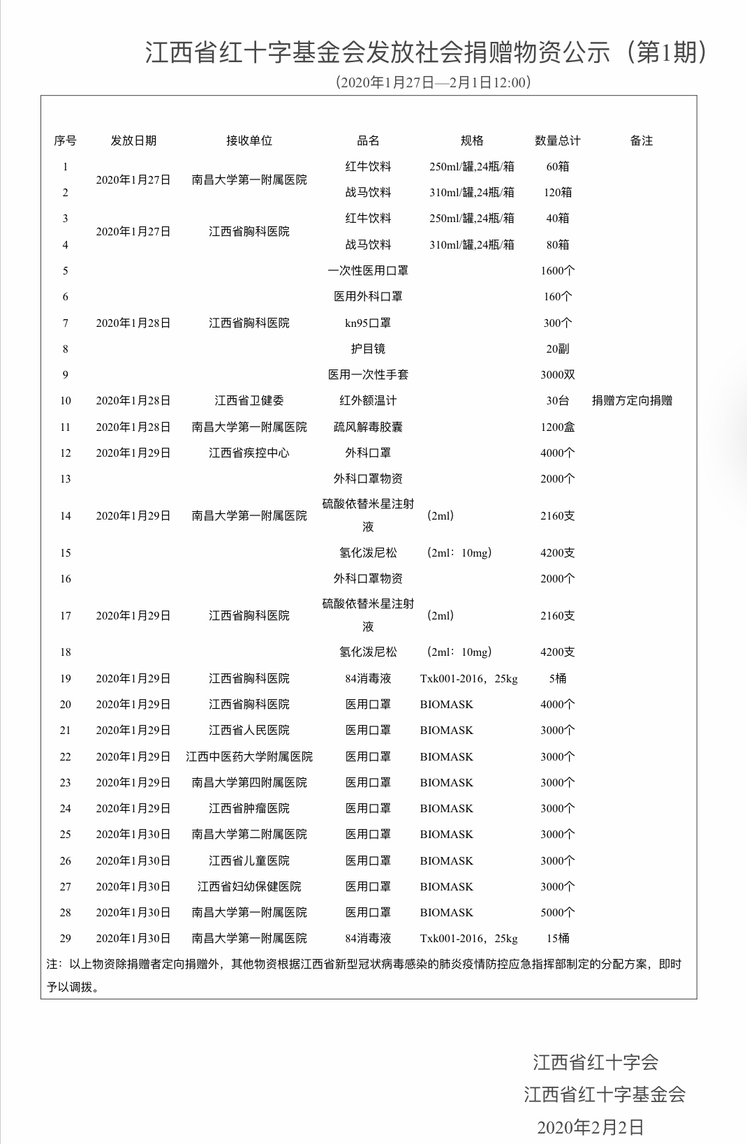江西省紅十字基金會發放社會捐贈物資公示(第1期)