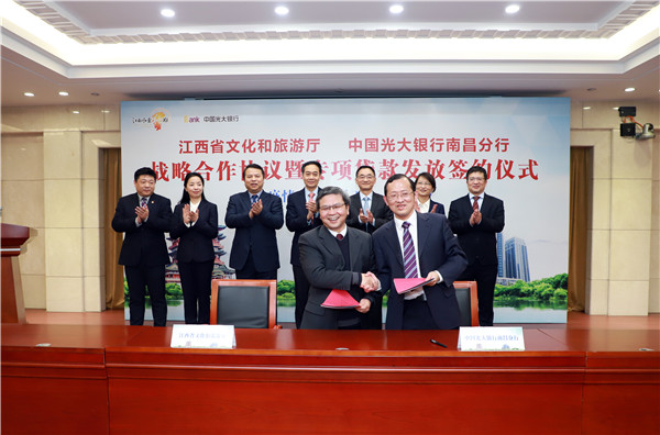 會上,江西省文化和旅遊廳與光大銀行南昌分行簽訂戰略合作協議,在未來五年,光大銀行南昌分行將積極向集團和總行爭取專項信貸資源,在江西省文旅產業領域投入不低於100億元人民幣的資金支持。