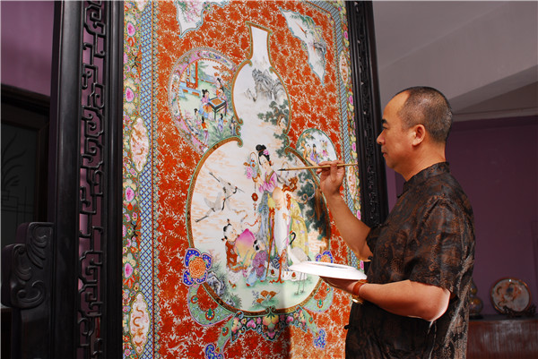 廣彩國家級非遺代表性傳承人譚廣輝在創作大型瓷片作品