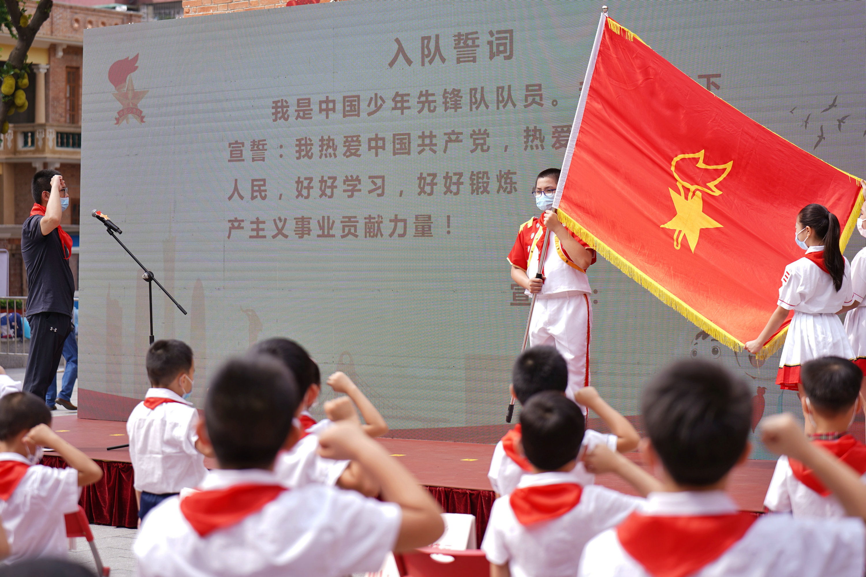 今天的儀式,除了邀請廣州市屬學校和11個區的新入隊隊員代表來到現場,參加集體入隊儀式,還邀請革命英雄、抗疫先鋒、扶貧先鋒、優秀團員等5位先鋒人物來到活動現場,為新隊員們佩戴紅領巾,發出寄語,儀式後還跟隊員們分享了他們的先鋒模範故事。