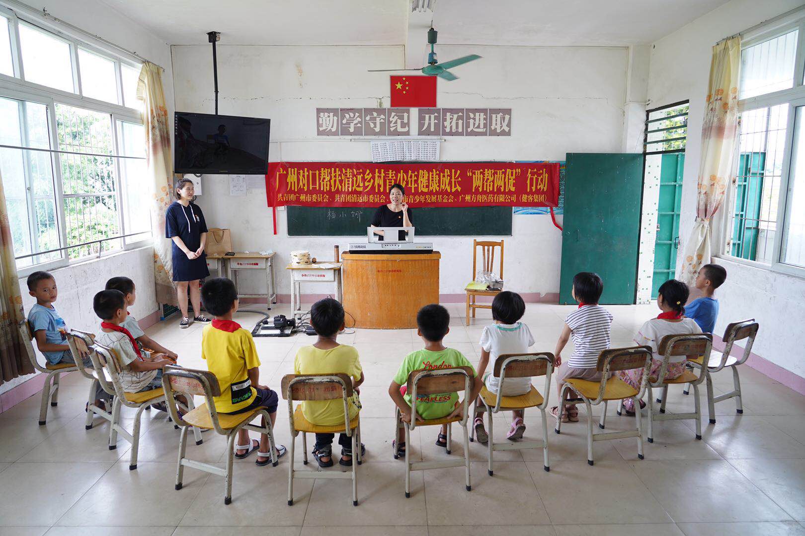 當天下午,廣清兩地團委、廣州市青年志願者協會南山志願服務總隊志願者、藝術老師代表共同到清新區浸潭鎮新圍村委會開展送教下鄉、愛心義診、送醫送葯、助殘志願服務等活動,為山區困難群眾提供健康服務支持,助力提升貧困孩子的藝術素養水平。