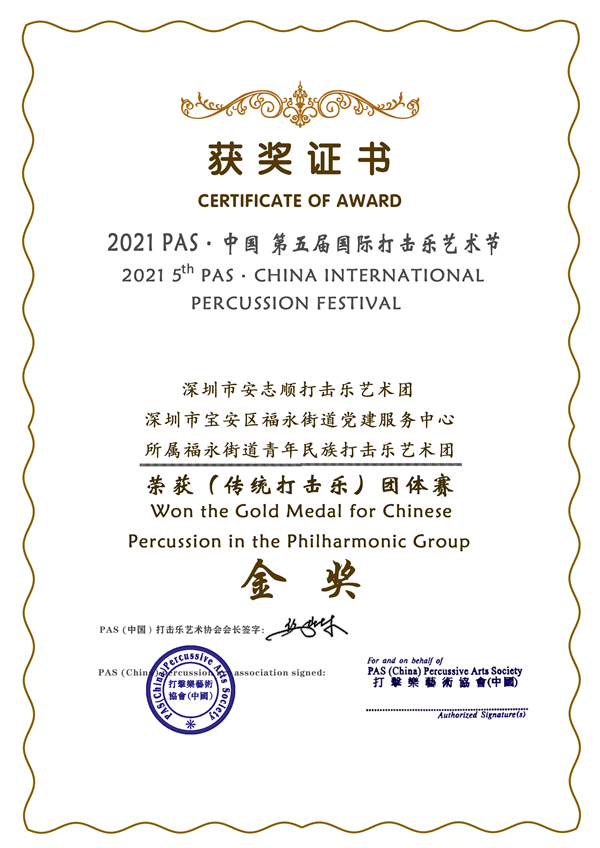 於日前圓滿結束的"PAS·中國第五屆國際打擊樂藝術節」,是由PAS(中國)打擊樂藝術協會、北京西城區文化館、金帆音樂廳聯合主辦的。深圳參賽團隊,以原創鼓族合奏《騰飛》摘取本次藝術節「傳統打擊樂團體賽」的金獎。