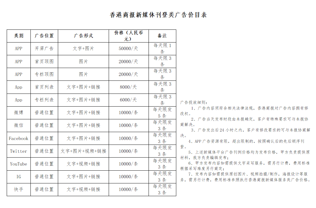 | 香港商報廣告刊例報價表 |