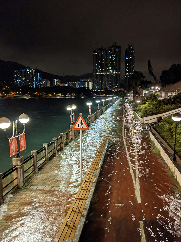 過去多次在風暴期間水浸的港島東區杏花邨,昨日凌晨時分不斷有海水湧上岸,海濱長廊出現海水倒灌,昨晨有市民專程到岸邊感受風力。昨日凌晨2時,大澳水位達最高峰,有棚屋被海水湧入屋,民安隊員早前已抵達戒備,協助居民將屋內電器等物品搬到高處,其間有一名女子因水浸被困家中,由消防和警方人員救出,她並無受傷。
