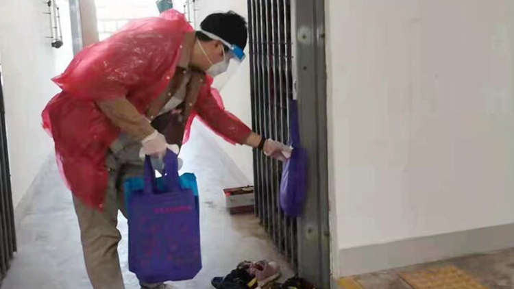 頂圖:社區幹事上門為區內基層家庭送物資。
