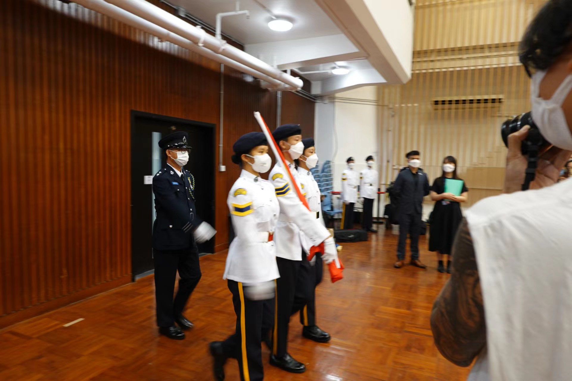 民安隊轄下少年團儀仗隊到港專賽馬會本科校園進行升儀式,向「港專升旗隊」隊員作示範。