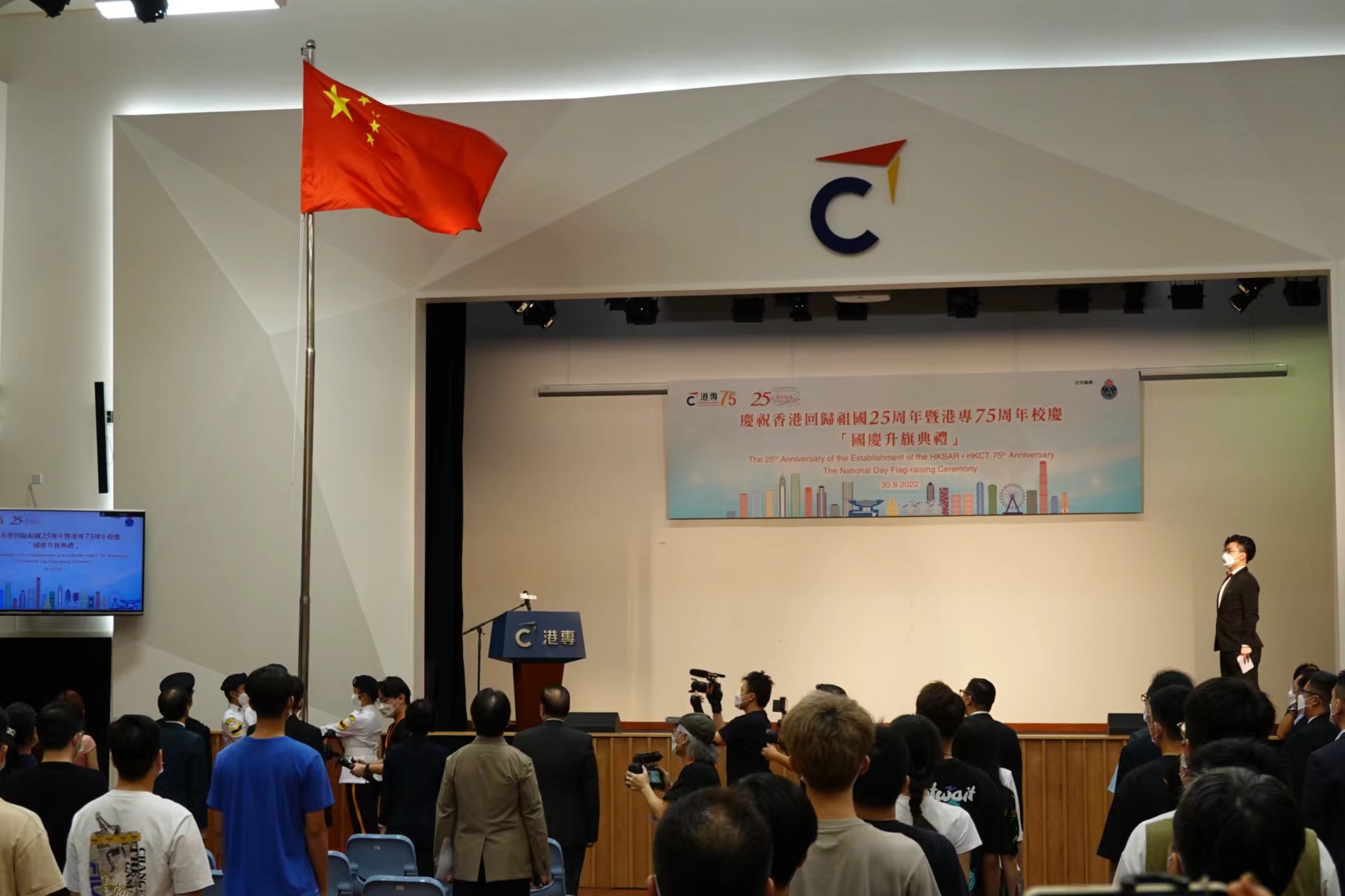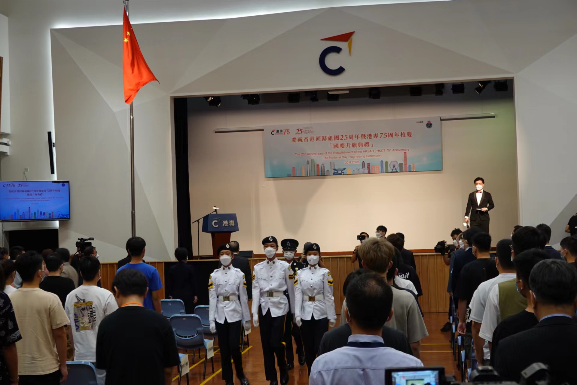 十一國慶前夕,港專今日(30日)舉行「慶祝香港回歸祖國25周年暨港專75周年校慶國慶升旗典禮」,由民安隊轄下少年團儀仗隊親臨港專賽馬會本科校園進行升儀式,向「港專升旗隊」隊員作示範。是次升旗典禮獲全國人大常務委員會委員、香港專業進修學校校董會榮譽主席譚耀宗,保安局局長鄧炳強,教育局局長蔡若蓮等嘉賓支持出席。