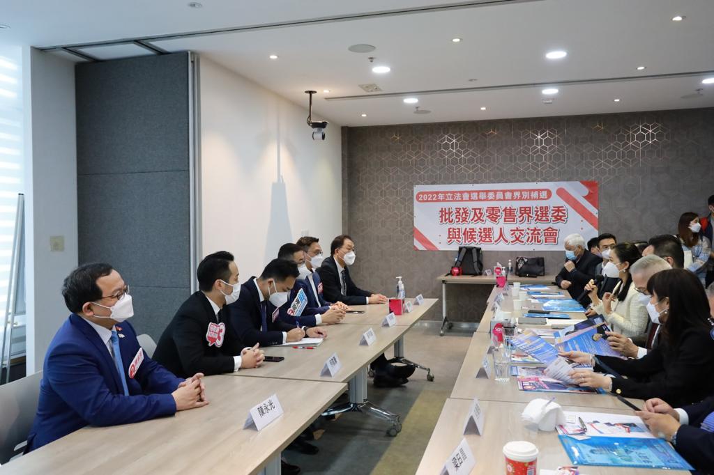 頂圖:批發及零售界選委與候選人交流會,出席人士包括6位候選人黃錦輝、陳永光、何敬康、黃梓謙、尚海龍和李廣宇,還有約20名批發及零售界選委。