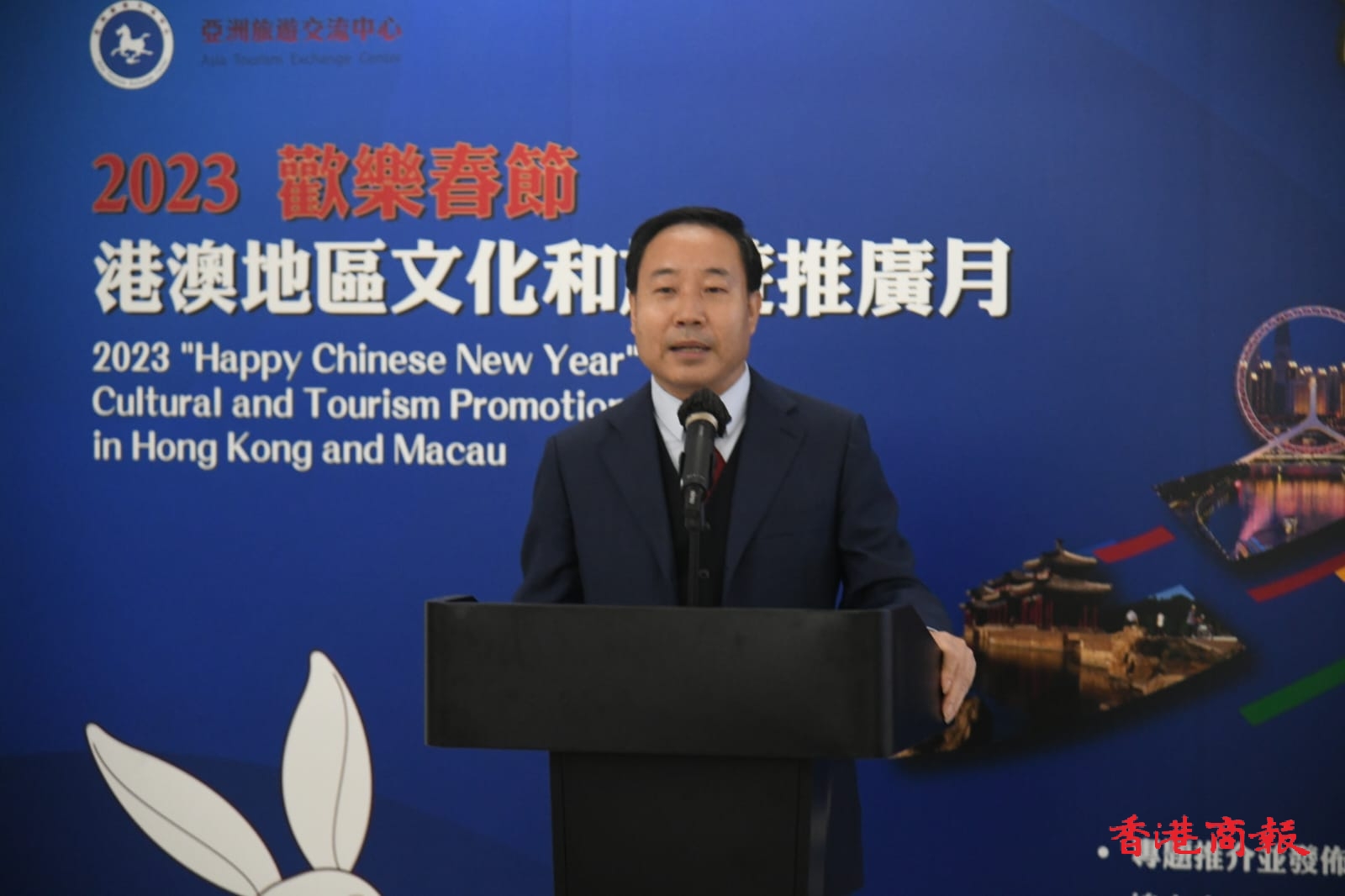 「2023歡樂春節港澳地區文化和旅遊推介活動」暨推廣月啟動儀式今日(18日)假位於金鐘的亞洲旅遊交流中心舉行,港澳特區文化和旅遊部門及業界、航空界、旅行商約60名代表參加。主要嘉賓有亞洲旅遊交流中心主任張棟、中聯辦經濟部副部長呂峰、澳門立法會議員張健中、香港旅遊事務署專員沈鳳君、香港旅遊業監管局主席馬豪輝等。
