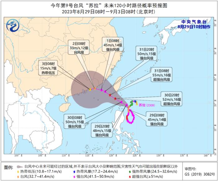 大風預報:8月29日14時至30日14時,巴士海峽、台灣海峽、台灣以東洋面偏南海域將有6-8級、陣風9-10級的大風,其中巴士海峽海域風力可達9-10級,部分海域風力可達11-13級,「蘇拉」中心經過的附近海面的風力有14-16級、陣風17級及以上,請過往船隻注意航行安全。