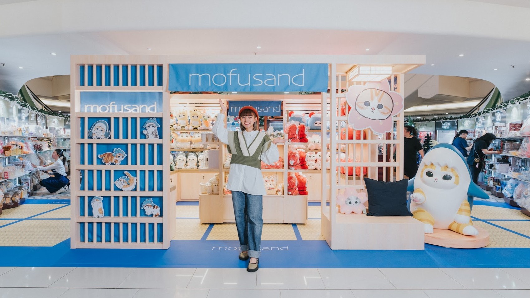 日式小屋的門口掛着印了貓掌的和風門簾,而多隻鯊魚造型貓咪在日式趟門上擺着不同的姿勢作點綴,小屋使用原木色為主色,門前並設計了一個茶室打卡位置,擺放着蒲團坐墊,屋後有兩隻巨大鯊魚造型貓咪在木窗擺着不同姿勢「賣萌」,讓粉絲拍照留念。店內設有各款限定商品,除了有「鯊魚貓」外,mofusand亦化身不同造型產品,包括招財貓水晶球、富士山夜燈、八爪魚毛絨吊飾、達摩造型盲盒等。爲了迎接聖誕,店舖首度推出mofusand聖誕cosplay商品,包括聖誕咕𠱸、聖誕樹毛絨吊飾等精品。店舖亦搜羅多款卡通角色精品例如LuLu豬、角落生物 、迪士尼系列、Sanrio系列等商品,爲聖誕禮物提供眾多選擇。(記者、部分圖片:Karena)