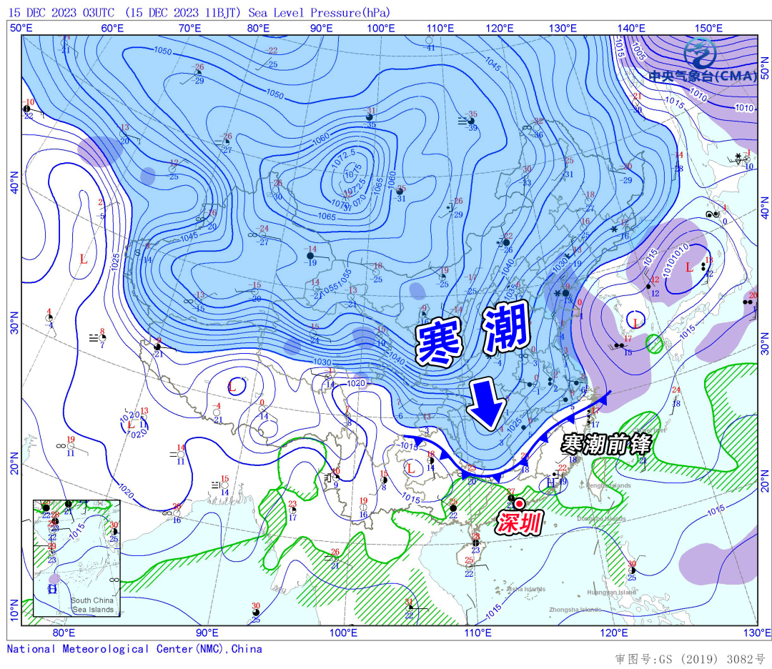預計寒潮越過南嶺,在16日凌晨抵達深圳時減弱為強冷空氣。受其影響,16日凌晨起我市轉陰天有分散小雨,氣溫驟降,北風加大,16日白天氣溫在11-14℃之間,體感陰冷;17日早晨最低氣溫降至9-10℃;18-19日氣溫短暫回升;20日新一股冷空氣補充影響,氣溫進一步下降,轉晴冷。