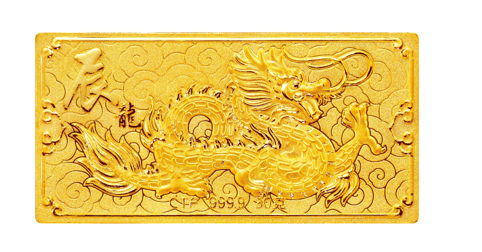 周大福足金金條推出「福瑞呈祥」款式。金條以氣勢磅礴的金龍為主角,配以卓越工藝,鑄造出靈動的龍態,龍爪雄勁抓着龍珠,穿梭於祥雲波濤之中。金條背面分別刻上「福瑞呈祥」及「龍騰萬里」,為新春帶來好兆頭。