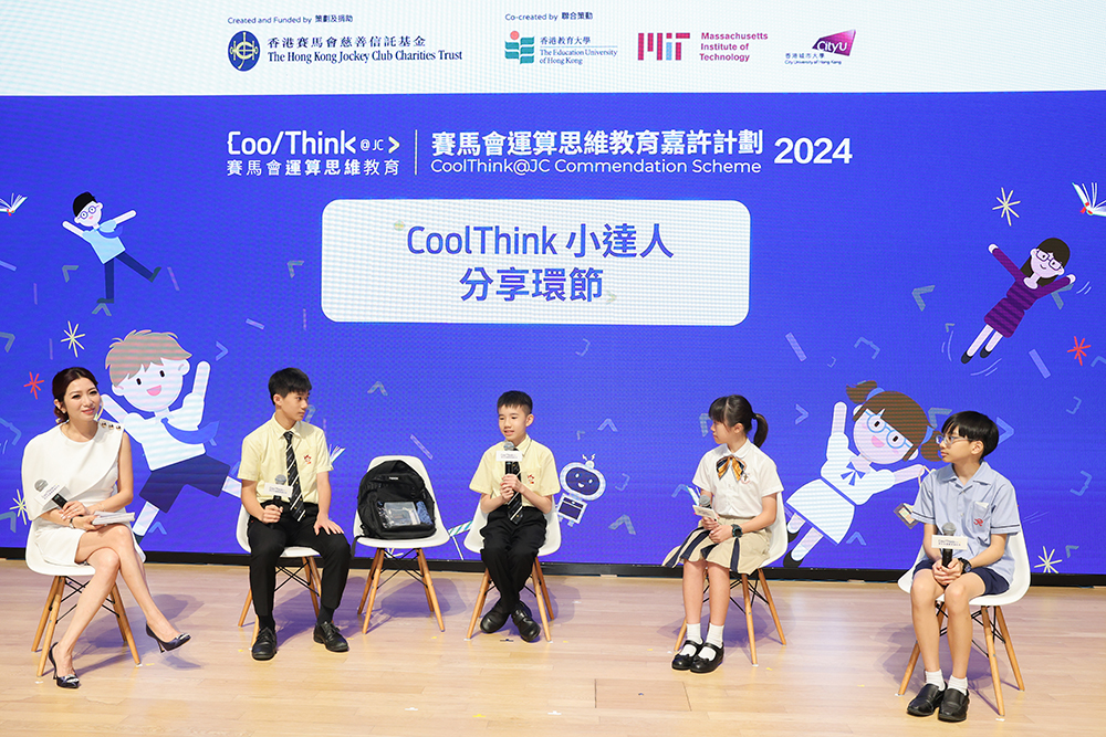 「賽馬會運算思維教育嘉許計劃2024」的4位學生以「學會『如何學習』」為題,分享運算思維概念有助在各學科或環境中成長。培僑書院中一學生陳同學和歐陽同學展示「智能在線書包I-smart school bag」,他們正在不斷改進「智能在線書包」設計,希望更多小學生可受惠。佐敦道官立小學六年級非華語學生戴家禮分享運算思維如何幫助他發展新技能和能力,在學校的信心與參與度產生深遠影響。祖堯天主教小學6年級學生蕭楚嵐亦分享在校內扮演CoolThinker小老師的經驗,積極幫助學生們學習運算思維。