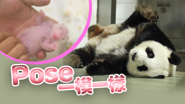 園方又在帖文發放一張大熊貓「盈盈」在地上仰臥的相片作為對比,又形容:「有其母必有其子!Pose都一模一樣。」