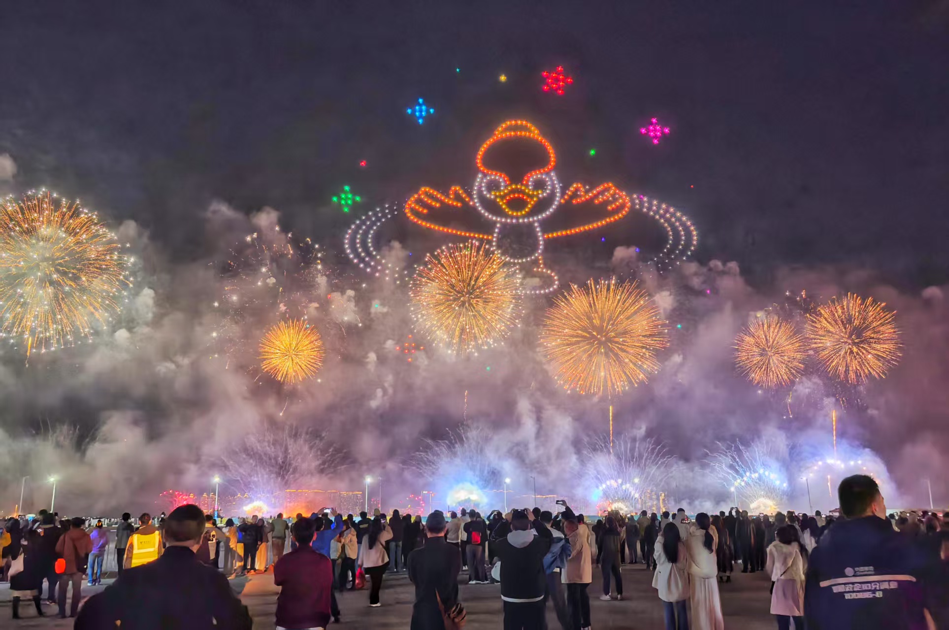 海面騰空而起的彩牡丹煙花,紅如火、粉似霞、紫如夢,在滿天金色閃耀中宣告春天的到來。隨後,無人機在夜空中變換陣型,展示出「巳巳如意 美美至汕」的字樣,傳遞着汕頭人民對海內外朋友的美好新春祝福。緊接着,潮陽剪紙造型的「新正如意」在閃耀禮花的簇擁下「飛」入夜空,並用英文、泰文、韓文、日文、阿拉伯文5種語言向全世界送上新春問候。值得一提的是,今年是「春節」被列入人類非遺名錄後的首個春節,這一環節也成為中華優秀傳統文化促進人類文明交流互鑒的生動案例。
