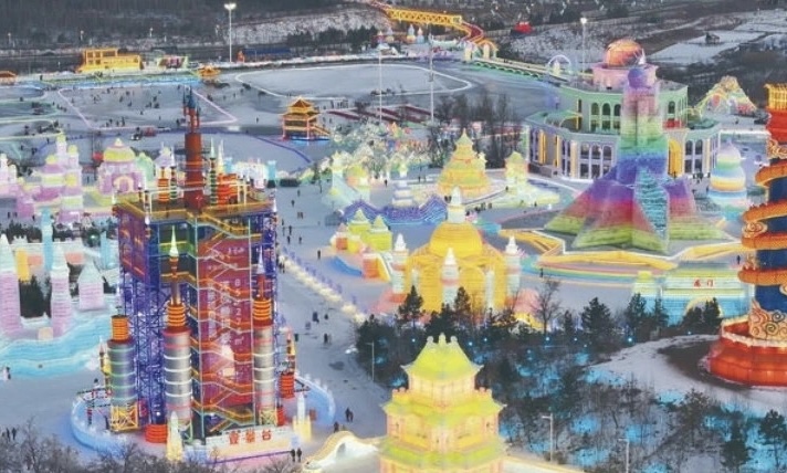 長春世界雕塑園首屆「冰雪幻彩嘻都匯」同樣精彩紛呈。園區秉持多元文化融合理念,國潮冰建區將君子蘭與大唐國風冰景巧妙融合,古韻悠然;另有凱旋門、金字塔等世界名勝冰雕,呈現出濃郁異域風情。期間,俄羅斯專業團隊帶來的《冰上芭蕾》表演,舞者於冰面翩然起舞,冰光與舞姿相映成趣,美輪美奐。園區工作人員向記者介紹:「此次活動匯聚歐美、亞洲眾多藝術家,創作過程中大家交流靈感、切磋技藝,力求通過冰雕作品展現多元文化魅力,為遊客呈獻頂級藝術盛宴。」
