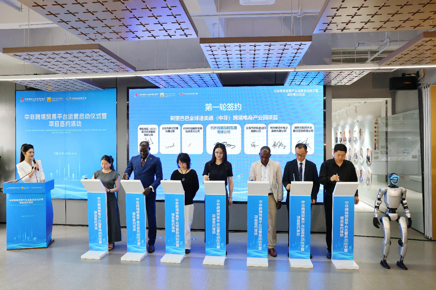 6月10日,中非跨境貿易平台運營啟動儀式暨項目簽約活動在長沙經開區中非經貿總部大廈舉行。湖南省商務廳黨組成員、副廳長郭寧,長沙市政府黨組成員、副市長鄭平,長沙經開區黨工委書記、長沙縣委書記付旭明,長沙經開區黨工委副書記、管委會主任蔣紅波,星沙海關黨委書記、關長、二級巡視員程碧雲,長沙經開區黨工委副書記趙文驕,以及阿里巴巴全球速賣通、亞馬遜雲科技的高管代表出席活動。