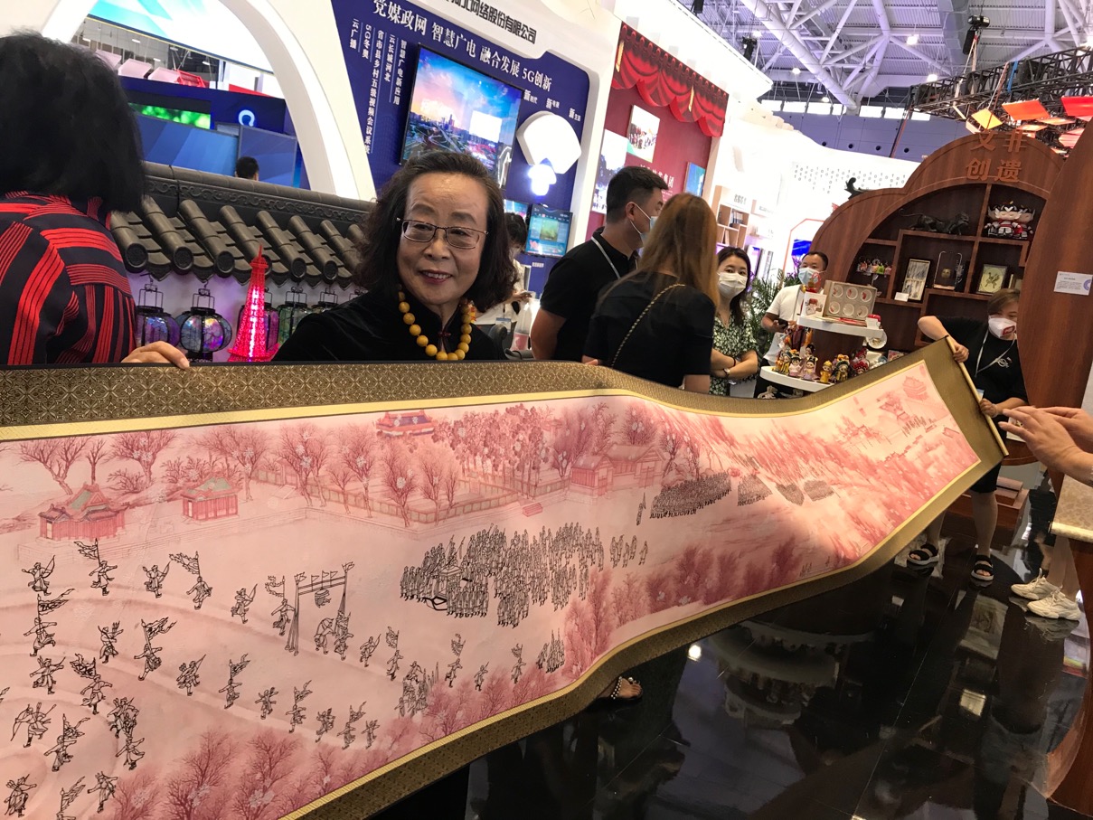 本屆文博會上,河北展區以雪花結構線條為設計靈感,倒計時牌、冬奧會吉祥物,冬奧特許商品、文創產品及滑雪運動裝備器材等,熱熱鬧鬧地烘托出喜迎冬奧的氛圍。此外,河北蔚縣剪紙第三代傳人周淑英的一幅長16米的剪紙長卷《冰嬉圖》,生動再現了盛清時期皇族盛大隆重的冰上「賽事」,與「喜迎冬奧」相互呼應,非常「應景」。