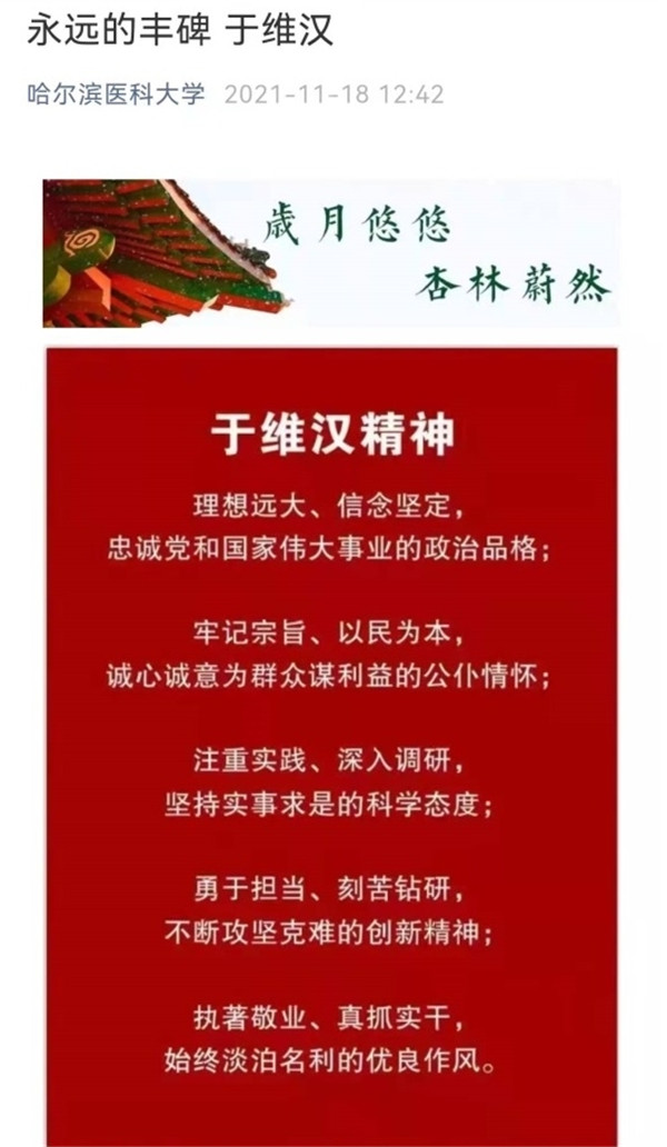 11月18日,學校官微推出了於維漢院士百年誕辰紀念文章,播出了離退休老幹部處錄製的弘揚於維漢精神的詩朗誦,團委學生錄製的演繹於維漢感人事跡的校史話劇,讓師生們再一次感受到於維漢精神在一代代哈醫大人身上的薪火相傳,激勵他們堅定傳承和發揚,擔當使命,接好奮進新時代的「接力棒」。